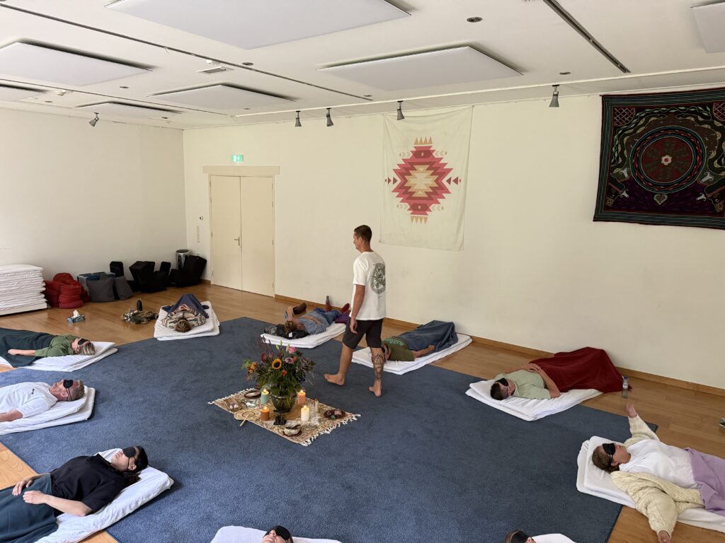 Bij een begeleide ademsessie ga je comfortabel liggen op een matrasje in de zaal, waarbij je door instructies en met muziek en instrumenten wordt begeleidt om in een diepere laag van jezelf te landen.